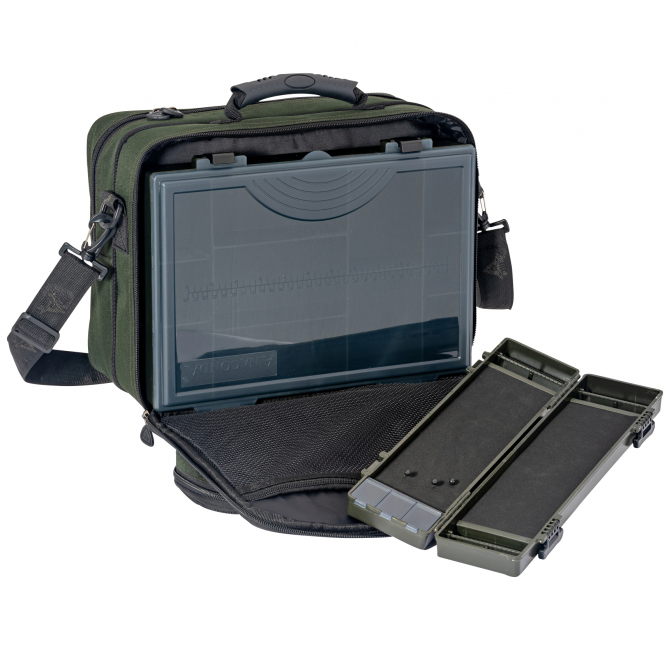 Ideal bag with 2 main compartments for rigs, terminal tackle, and leader material. With a front compartment (35 x 20 x 6 cm), integrated mesh pocket, and a shoulder strap. Includes rig carrier and tackle chest large. External dimensions: 37 x 20 x 32 cm. Compartments 1 and 2: 37 x 30 x 7 cm each. With water-repellent PVC coating.