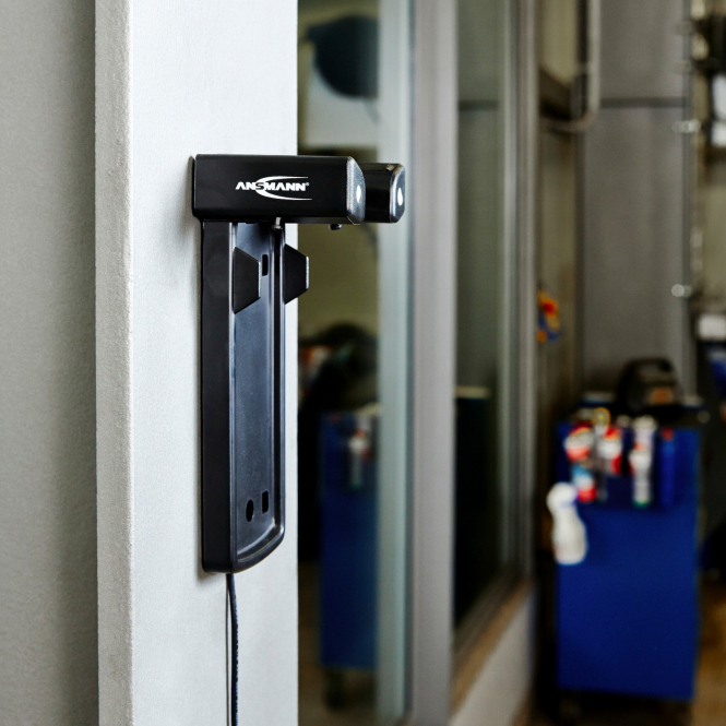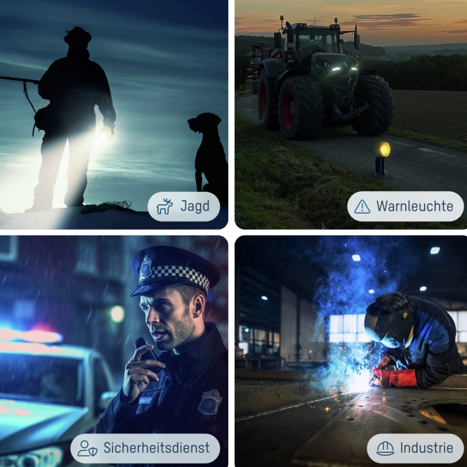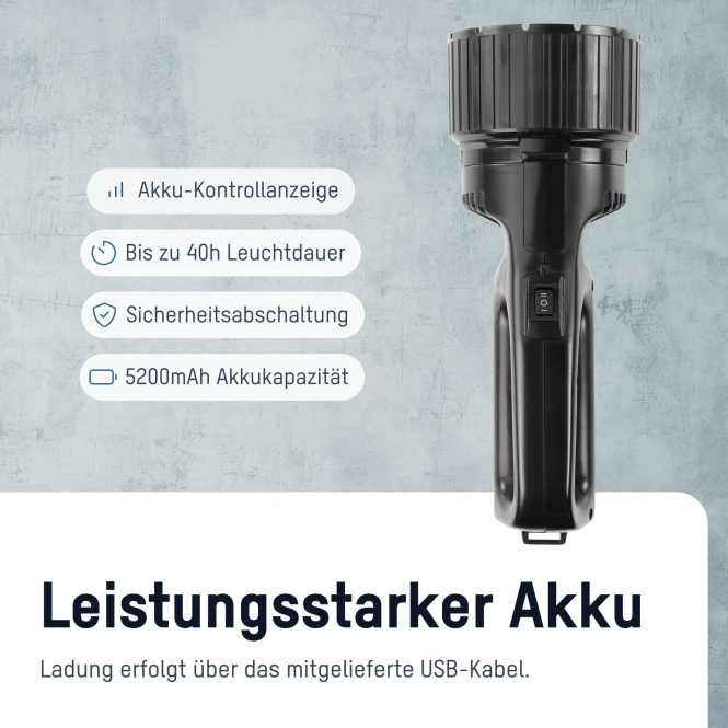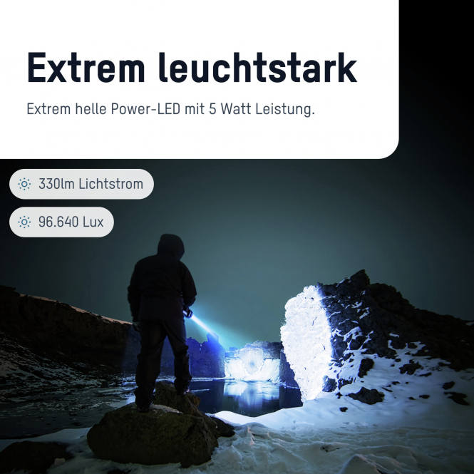 The spotlight offers two brightness levels via its switch: 100 % output (330 lumens) and 20 % output (70 lumens). The focusing mechanism on the lamp head allows infinite beam adjustment. Integrated power failure electronics ensure the spotlight automatically activates as an emergency light when charging and mains power is interrupted. The Duo-LED displays battery status and remaining capacity.