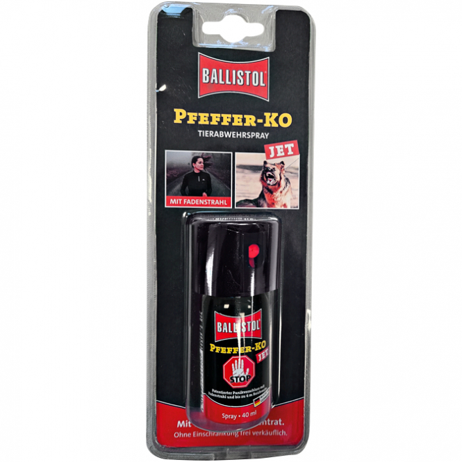 Ballistol Pfeffer-KO (Jet) is an extremely potent pepper spray designed for animal deterrence and self-defense, featuring 11% OC (oleoresin capsicum) and up to 1 million Scoville heat units. The non-flammable jet spray is safe for use indoors and delivers reliable protection.
