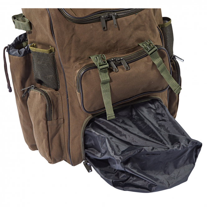 The perfect companion for hunting. A separate compartment for wet clothes or equipment, for example, keeps the rest of the contents dry – ideal for changeable conditions. Versatile outer pockets with drawstrings or zips provide quick and secure access. With mesh pockets for bottles or accessories, as well as a double lid with additional storage space. The padded, ergonomic carrying system and comfortable back make even long trips pleasant. Two robust hooks allow the backpack to be hung from trees, raised blinds or other structures. Velcro straps provide flexible attachment options for sleeping bags, mats or other accessories. Made of durable canvas material, the backpack is extremely robust and durable – perfect for use in demanding terrain. Capacity: 45 l + outer pockets approx. 5 l.