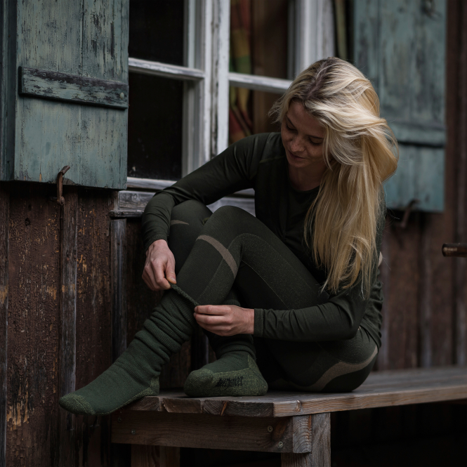 Classic long wool socks in a luxury version with extra soft terry cloth. Colour: olive.