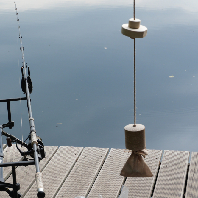 Contents: Set contents: BissMagnet bait stone with natural long-lasting bait offering up to 48 hours of attractiveness, line for securely attaching the stone, a weightable bag filled with sand or stones for easy anchoring in the water, and 2 wooden floats for greater visibility and flexible positioning (upper float visible at the water’s surface).
