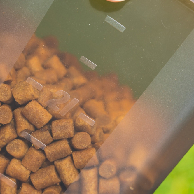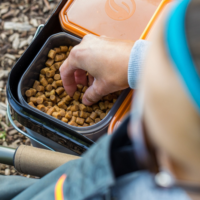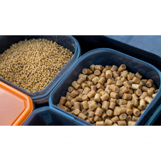 With a capacity of 17 litres and four separately insertable containers, it allows different baits or feed mixtures to be prepared separately and then combined as required directly at the water's edge. The individual containers can be stacked to save space and allow for precise portioning thanks to their 0.25-litre markings on the side. Suitable for freezer storage.