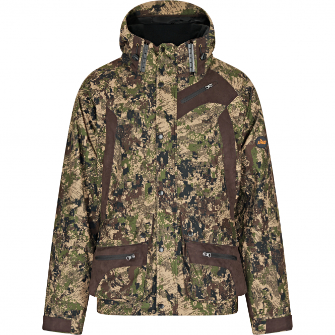 Contrasting details in harmonious brown tones give the jacket a stylish, understated design that blends in perfectly with its surroundings. Three practical chest pockets with zips and two patch pockets, each with two compartments (zip and button), offer plenty of storage space for equipment, ammunition or small items – complemented by a convenient rabbit pocket on the back.