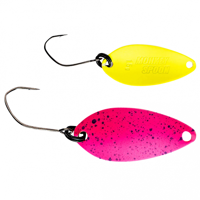 The Monkey Spoon from Monkey Lures comes in 3 different shapes and different weights, covering a wide range of applications and making it a kind of secret weapon for trout fishing. These lures also score points with their unusual designs and attention to detail, which makes them a must-have for trout area enthusiasts. The finish of the lures is very high quality and designed in the well-known and popular Monkey Lures patterns. These are protected from damage, such as during transportation, with a double layer of clear varnish.