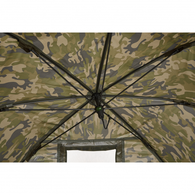 A good brolly for a short session. Comes with a fully removable, zip-in/zip-out solid front panel fitted with a camouflaged mosquito net door. The durable 210D double-coated camouflage fabric offers a water column of 10,000 mm. Includes four adjustable storm poles, a front storm strut, pegs and a bag. Dimensions: 255 x 190 x 135 cm. Weight: 7.6 kg