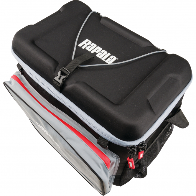 With waterproof EVA base and fabric, front pocket with D-ring and mesh side pockets. Offers space for 7 size 3700 boxes (2 boxes included). Dimensions: 41 x 40 x 32 cm.