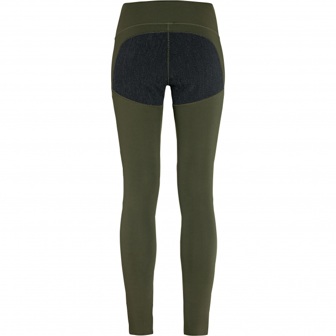 Extremely durable trekking tights with reinforcements on the seat and knees, made from durable double-knit stretch fabric made from recycled polyester with a matte, opaque finish. Reinforcement material with a water-repellent finish for extra protection in rough terrain. The Abisko Trekking Tights HD W are well-fitting technical functional tights that are perfect for trekking adventures where you need full freedom of movement and durability. Comfortable with a high waistband and internal drawstring, long legs and a flat hem. Secure leg pockets, one with a zip and one with an overlapping closure, angled for easy access and a flattering fit. Colour: Deep Forest.