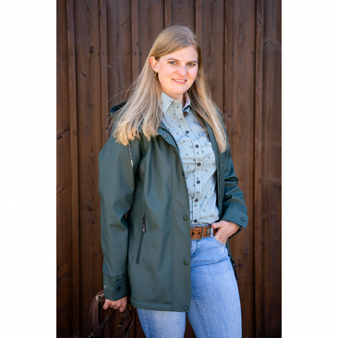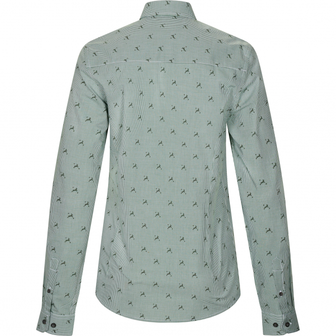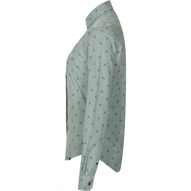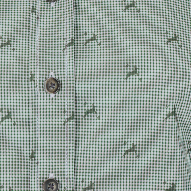 Versatile, combinable slim fit blouse in a check design with little deer. The figure-hugging blouse impresses with feminine elegance and loving details such as the pink ribbon in the collar and the coloured buttons. The inner fabric in white with little deer is an eye-catcher that underlines the modern design. Colour: olive.