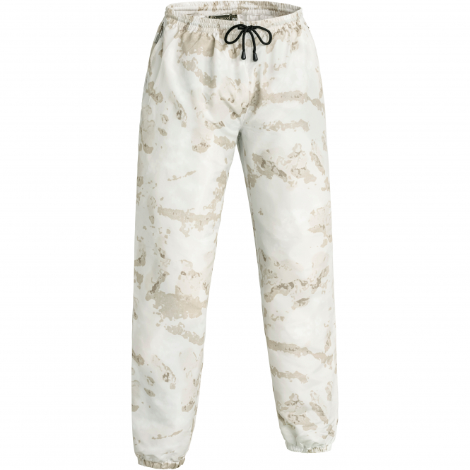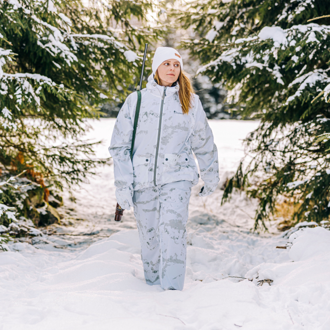 Lightweight and breathable camouflage suit – easy to pull on. Jacket with large front pockets that close with press studs. Fixed, adjustable hood. Trousers with 2 pockets and elasticated waistband with drawstring. Elasticated cuffs and ankles. Extra water- and dirt-repellent properties thanks to Bionic Finish® Eco. Colour: white/camouflage.