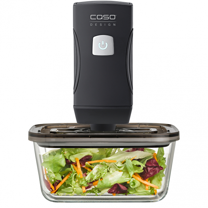 The CASO Vacu One Touch Pro Set handheld vacuum sealer is convenient, cordless and keeps food fresh up to eight times longer. A powerful pump with a capacity of 12 litres per minute and a long-lasting lithium-ion battery with up to 85 minutes of runtime enable fast and reliable operation – without any preservatives. This ensures that vitamins, minerals and flavours are optimally preserved. Thanks to the practical charging station with USB-A and USB-C ports, the device is always ready for use and can be used flexibly, whether in the kitchen or on the go. The extensive range of accessories makes this set particularly versatile. Four stackable glass VacuBoxxen with capacities of 2600 ml, 1500 ml, 800 ml and 500 ml are ideal for vacuum sealing, storing and serving. They are robust, tasteless, stackable to save space and dishwasher and microwave safe. The set is complemented by 15 reusable Vacu ZIP bags in various sizes, which can be sealed quickly and airtight. This saves time, money and plastic, making the Vacu One Touch Pro Set a sustainable and professional solution for the modern household. Dimensions: 13.5 x 19.0 x 11.5 cm. Weight: 590 g.