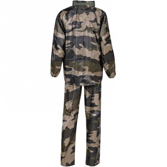 This set consists of a jacket with two pockets and trousers with an elasticated waistband, hand vents and a drawstring at the waist. The material is polyester with a polyester coating and welded seams. Colour: camouflage.