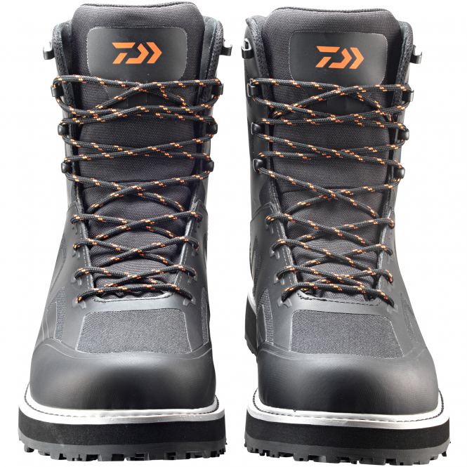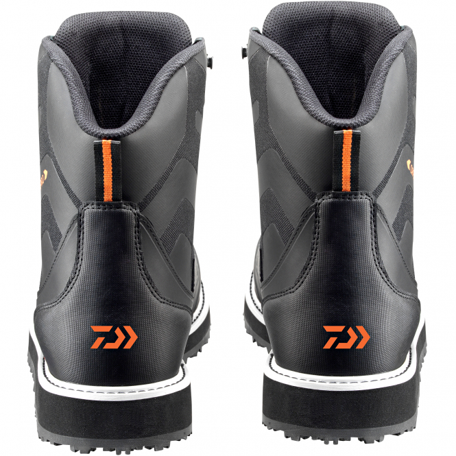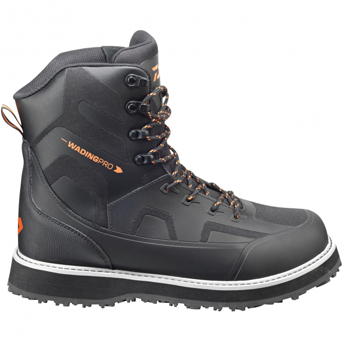 Lightweight, sturdy wading shoe for neoprene and breathable waders. Padded high shaft, reinforced heel and toe for comfort and support. Quick-drying upper material, grippy rubber sole, cushioning EVA midsole. Corrosion-free lace eyelets and water drainage eyelets. Colour: black with orange details.