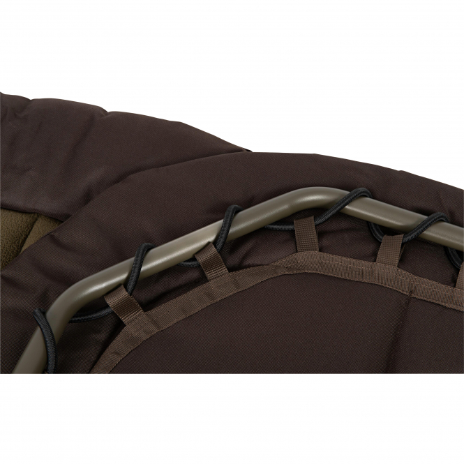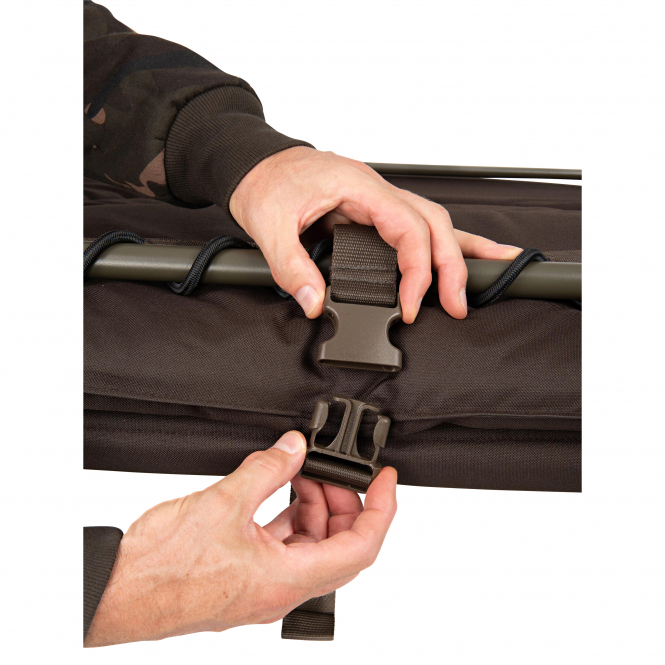 Six height-adjustable legs allow for optimal adaptation to different surfaces, whilst ball-joint mud feet ensure a secure footing. An integrated tension strap system allows for compact folding – even with a sleeping bag on top – thus making transport and storage considerably easier.