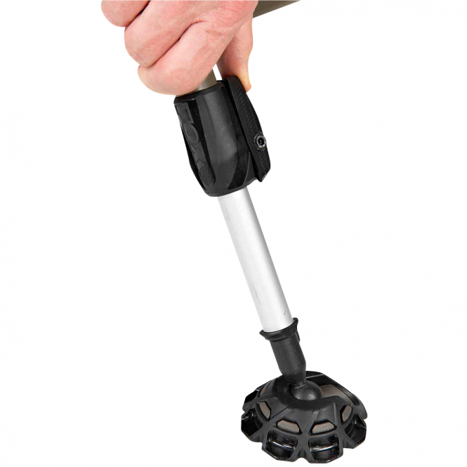 The Voyager is an extremely comfortable lounger, manufactured to high standards and offering a completely flat lying profile for maximum comfort. The design does not feature an adjustment screw, which maximizes the width of use, while the continuous back support system ensures a firm mattress without sagging. The padded mattress has a fleece cover and is held in place at the outer edge of the padding in the Voyager Marl color scheme. At the head end, there is an extra padded headrest for added comfort. Thanks to the double hinge joints, the lounger can be folded up including the sleeping bag, while unique side tension straps enable compact packing. Large ball-joint mud feet ensure stability, while six length-adjustable legs allow adjustment to different surfaces.