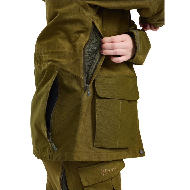 Windproof and waterproof women's hunting jacket with excellent ventilation thanks to mesh lining and side ventilation zips. Equipped with functional pockets, such as fleece-lined hand warmer pockets, patch front bellows pockets, two radio pockets and a GPS pocket. The ideal choice for female hunters and active dog handlers. This hunting jacket for women has been developed for active use in nature and in the field and offers reliable protection against wind and rain. It is made of a two-layer laminated material with a breathable, windproof and waterproof membrane, welded seams and a PFC-free, water-repellent impregnation. The air-permeable mesh lining and side ventilation zips ensure optimum ventilation even during intense movement.
