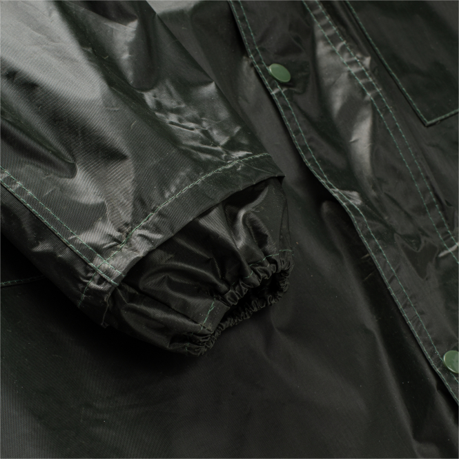 Waterproof raincoat with concealed 2-way zipper, heat-welded and waterproof seams, adjustable hood, elastic storm cuffs in the sleeve ends and large ventilation slit on the back. External pockets are protected against water penetration. Color: olive.