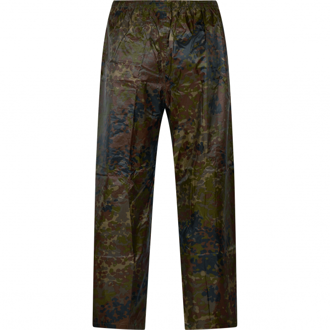 2-piece camouflage rain suit. Waterproof, with 3000 mm water column and taped seams. The jacket is equipped with two outer pockets and a high collar, in which the hood can be found. The trousers are equipped with two slots to reach the pockets of the trousers worn underneath. The delivery takes place in a practical transport bag.