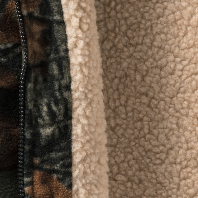Thermo fleece jacket in camou design. Hooded, width adjustment on the waistband and elastic in the sleeve cuffs. The thermo lining is provided with teddy fleece in the area of the torso and in the hood and offers particularly comfortable wear. With 2 hand pockets. Color: camou / green.