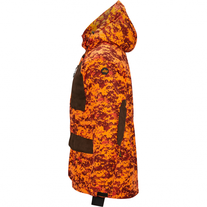 Thickly lined winter jacket for driven hunting. Thanks to the Lagotex membrane (water column: 8,000 mm, breathability: 5,000 g/m²/24h), this jacket offers optimal breathability and is wind and water resistant. The inner lining and extra thermal coating provide double protection against the cold and prevent you from getting chilled. The soft outer fabric makes the jacket very quiet, making it perfect for sitting in wait for wild boar. All seams are sealed to prevent moisture from penetrating. With a breast pocket, Napoleon pocket and two patch front pockets including slip pockets. The front pockets can be closed with silent magnetic buttons. The jacket also has a 2-way zip, which is protected from the wind by an extra magnetic button placket. Two inner pockets that can be closed with zips. With elastic bands inside to adjust the waist and hem. The arm openings can be tightened with a Velcro fastener. In addition, warm windproof cuffs with thumb loops offer additional protection. The neck area is made of warm fleece to provide extra protection against wind and cold. With an adjustable and detachable hood with a small peak. Colour: orange camouflage.