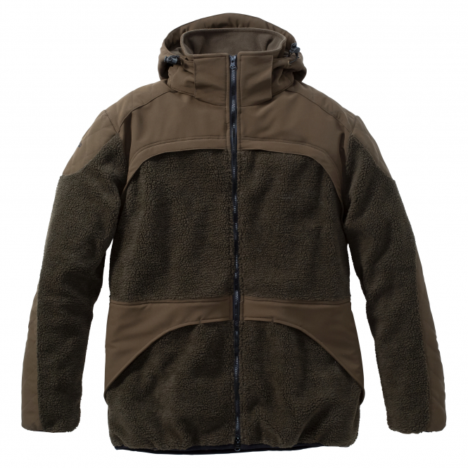 Super comfortable fibre fur jacket in an interesting 2-material look for the cold season, both for spontaneous territory tours as well as for long boar hunts. The straight cut and the soft, comfortable material also ensure freedom of movement. Equipped with two side pockets and one breast pocket, all pockets with zipper. The tight, high collar and the slightly lined hood area protect against cold and offer a high wearing comfort. The shoulder yoke, the collar area, the outside of the hood, the side area and the outside of the sleeves are made of smooth, easily washable material. The hood is adjustable and detachable by zipper. Colour: olive.