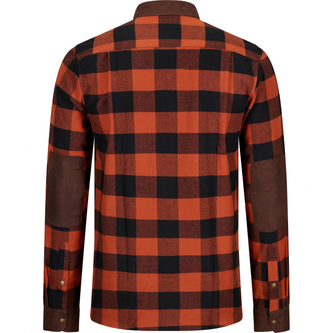 Long sleeve hunting shirt in a modern check pattern. The comfortable cut and the pleasant material provide ideal comfort. The collar and sleeve cuffs are contrasting colors in leather look. With two spacious chest pockets with zippers. Colour: rust brown.