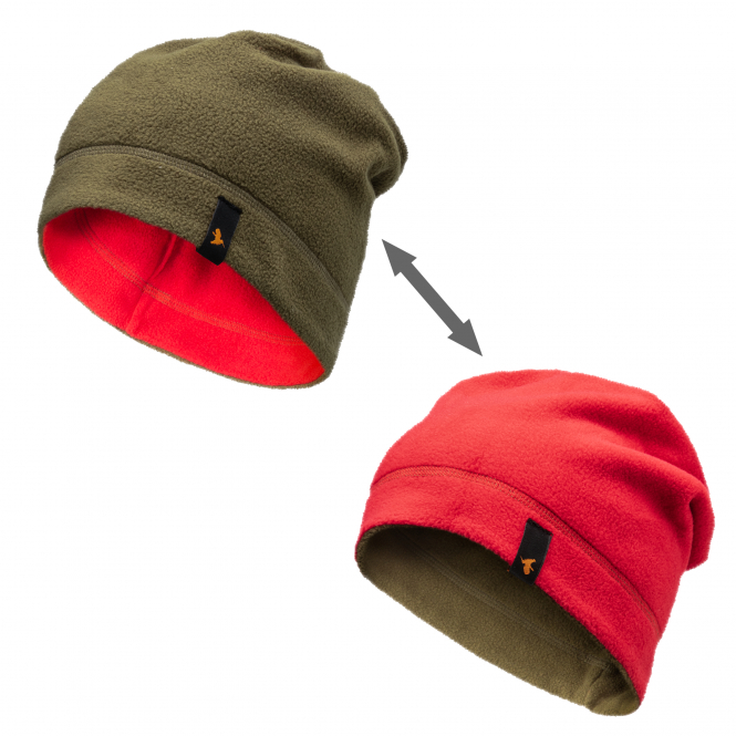 Reversible fleece neck warmer. Size adjustable with elastic cord and stopper. Reversible side in red.