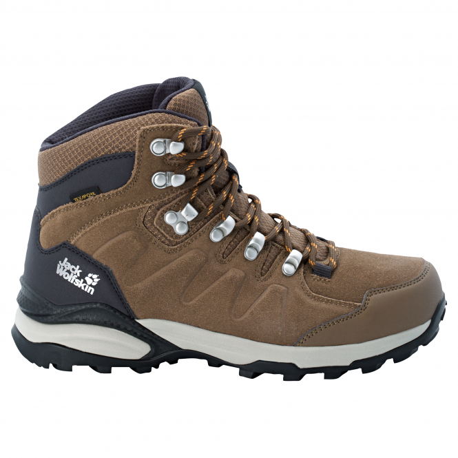 Waterproof hiking shoe with a grippy sole and an upper made of high-quality suede. The robust construction with stitched toe and heel protection and the noble metal lacing hooks make the shoe particularly valuable. Colour: brown/apricot.