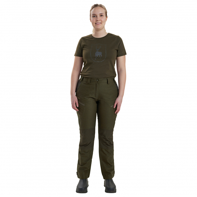 Die Lady Chasse Hose bietet Komfort und Bewegungsfreiheit mit elastischem Bund, vorgeformten Knien und verstellbaren Knöchelbündchen. Praktische Taschen mit Reißverschluss und eine versteckte Messertasche machen sie zur idealen Performance-Hose für Outdoor-Aktivitäten. Farbe: oliv.