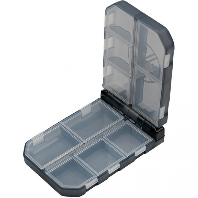 The LMAB Pocket Box keeps small accessories such as snaps, swivels, snap rings and more in order. It has a practical automatic closing mechanism thanks to an integrated spring and is semi-transparent so that you can quickly see the contents even when closed. The individual inner compartments are equipped with transparent lids and clip fasteners that securely store the contents and protect them from loss. A compact and practical solution for your small items.