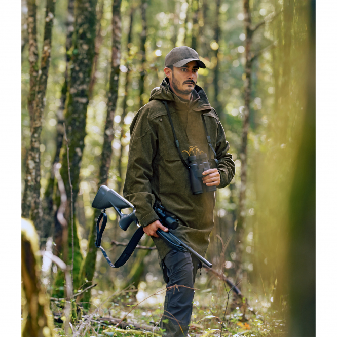 The material is particularly soft and quiet, making the smock ideal for hunting. A generous kangaroo pocket with cartridge loops provides quick access to important equipment. Side zips make it easy to put on and take off and also serve as ventilation slits. The adjustable hood provides reliable protection from wind and weather, while the adjustable waist ensures a perfect fit.