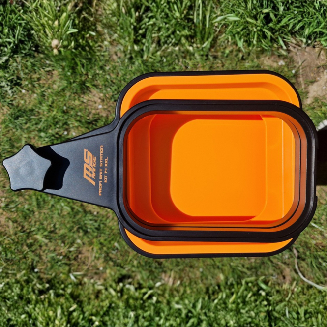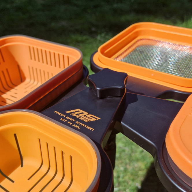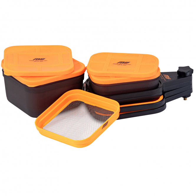 The MS Range Profi Bait Station Kit-14 XXL is a 14-piece, modular bait system for feeder and match anglers that combines boxes, sieves, and trays in a compact bait station. The adjustable and lockable support allows the system to be mounted directly onto a bankstick with a 3/8 thread and positioned securely at the fishing spot.