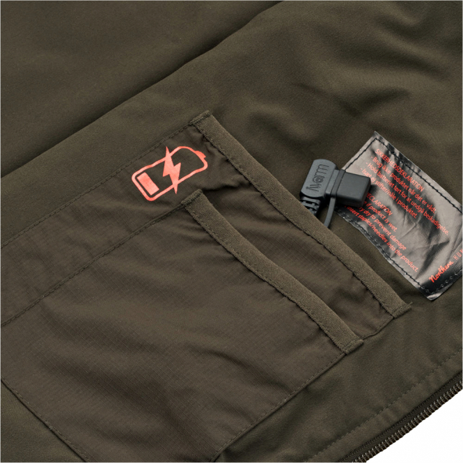 Made from a hard-wearing ripstop material. You can choose between 3 different heating levels at the touch of a button on the breast pocket. The heating panels are located on the centre back and on the chest. With a high collar that closes windproof and 5 pockets with zip. Requires a power bank (not included). With ECO impregnation. Colour: olive.