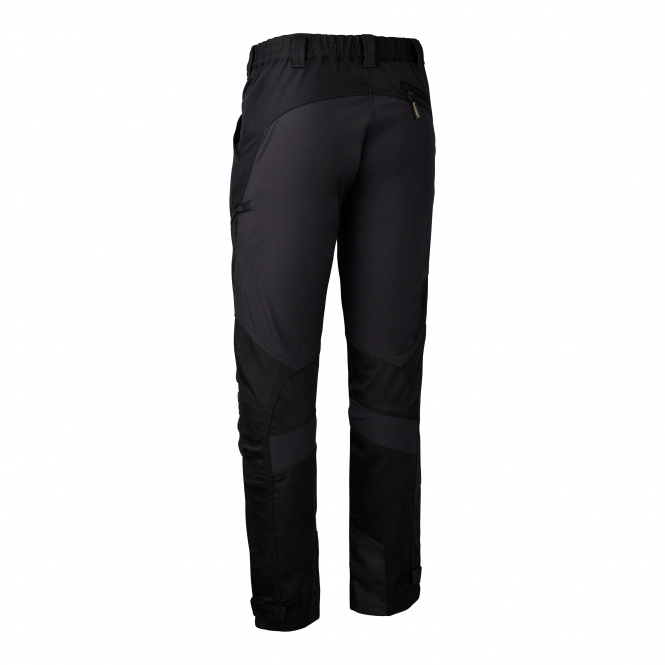 Robust trousers made of 4-way stretch fabric for greater freedom of movement and a good fit. With an elasticated waistband, two front pockets, two thigh pockets with concealed zips, back pocket with concealed zip, pre-shaped knees and reinforced leg cuffs. Adjustable leg cuffs with straps and Velcro.