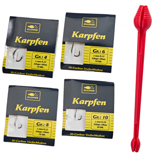 The Snapper Carp Hook Set offers you a carefully selected assortment of pre-tied hooks in sizes 4, 6, 8, and 10—10 pieces of each. This means you’re well equipped for a wide variety of baits and rigs when targeting carp.