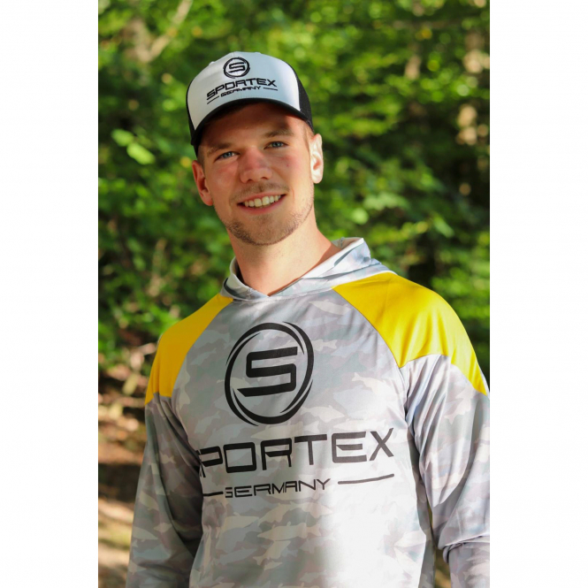 This Sportex shirt has a hood, but what makes it really special is the UV protection it provides. Visually, it is also definitely an eye-catcher in a gray camouflage pattern with yellow shoulder sections. The shirt is also decorated with a black Sportex logo. It is tested and certified in accordance with EN13758-2:2002.