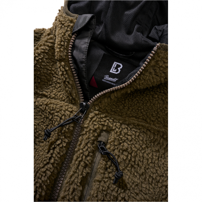 A deep-pile, warm teddy fleece jacket with high thermal performance. The breathable inner lining ensures a comfortable fit. With a spacious hood, chin guard and storm flap and elastic cuffs and waistband. Color: olive.