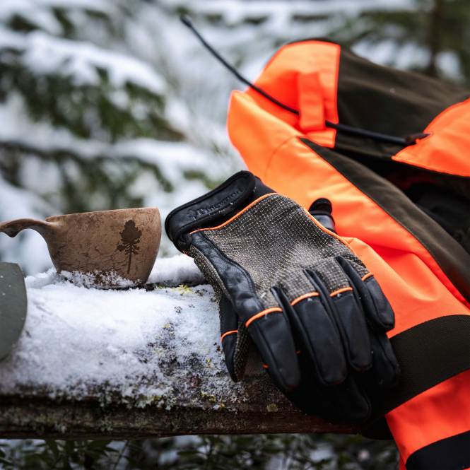 Robuster Jagdhandschuh aus Kevlar®, der Äste und Büsche widersteht. Er besteht aus weichem Ziegenleder und kann am Handgelenk mit einem Klettverschluss eingestellt werden, plus orangefarbene Details für zusätzliche Sichtbarkeit. Farbe: Mossgreen/Black.